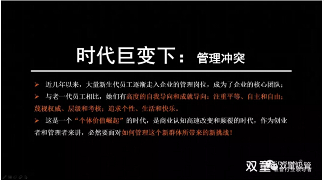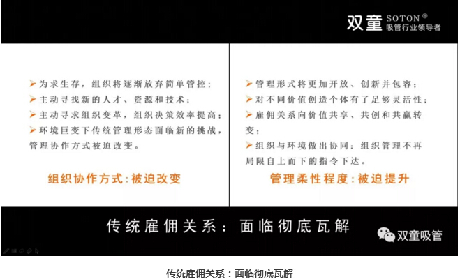 與此同時,民企也面臨著經(jīng)理人老化企業(yè)二代傳承兩座大山。在這樣的新時代背景下,管理進(jìn)入了信息管理時代,傳統(tǒng)雇傭關(guān)系面臨瓦解,管理協(xié)作方式改變,管理柔性程度被迫提升,員工與組織的雇傭關(guān)系逐漸變成了共生關(guān)系!管理形式將更加開放、創(chuàng)新并包容,對不同價值創(chuàng)造的個體就需要有足夠的靈活性,傳統(tǒng)雇傭關(guān)系逐漸向價值共享、共創(chuàng)和共贏轉(zhuǎn)變!