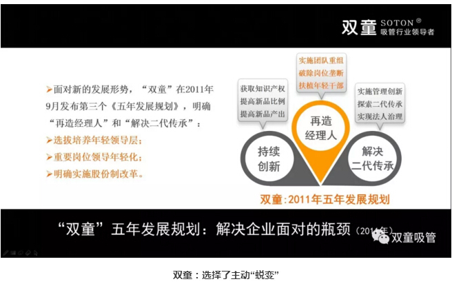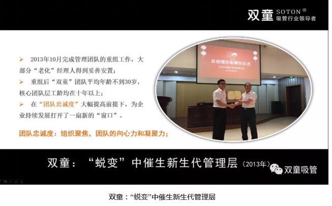 “雙童選擇了主動蛻變:基于上述瓶頸,公司在2011年發(fā)布了第三個《企業(yè)五年發(fā)展規(guī)劃》,明確再造經(jīng)理人計劃,明確領(lǐng)導(dǎo)層更替:選拔培養(yǎng)年輕領(lǐng)導(dǎo)層、重要崗位領(lǐng)導(dǎo)年輕化、明確實施股份制改革,慢慢解決管理層老化問題!重組后的雙童團隊平均年齡不到三十歲,大部分核心團隊的工齡在十年以上,學(xué)歷、知識層次和忠誠度大幅提高!