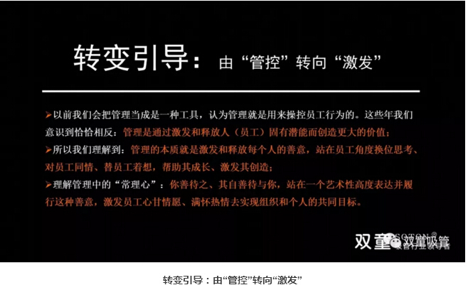 管理的本質(zhì)是管事而非管人:很多管理者把管理當(dāng)成一種工具,認(rèn)為管理是用來操控的,就必須操縱控制員工的行為。其實,是很難管的,你不能死死盯著一個人叫他做事情,員工內(nèi)心不配合盯著他也沒有成效,管人是典型人治,真正的管理從梳理事物開始。所以,管理不是管控、教條和賦予,而是激發(fā)和釋放每個人的善意,幫助員工成長、激發(fā)其創(chuàng)造,在共同追求中形成一致的價值和理念認(rèn)同。