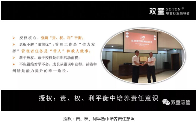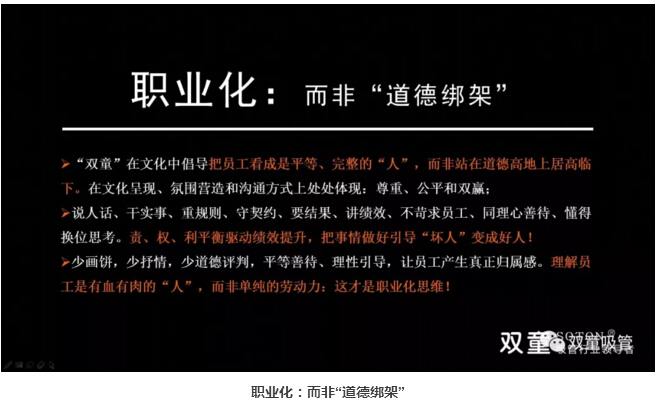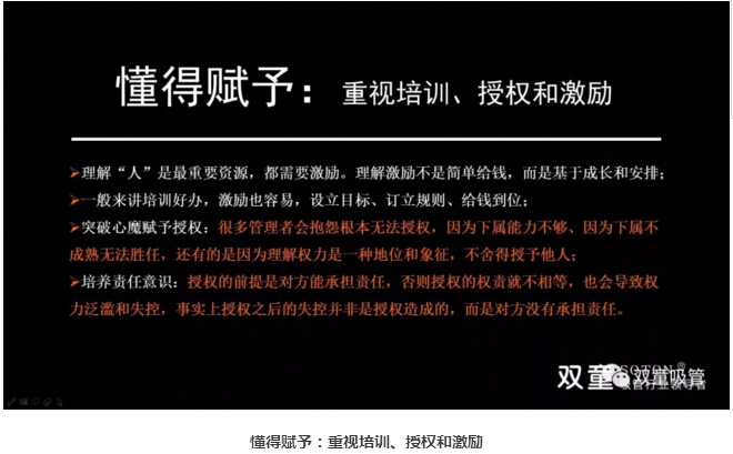 懂得賦予:重視培訓(xùn)、授權(quán)和激勵:接下來,樓仲平也和大家分享了管理者要理解是最重要的資源,都需要激勵。雙童通過學(xué)習(xí)會意識引導(dǎo),將員工的學(xué)習(xí)與職業(yè)升遷掛鉤,將年度學(xué)習(xí)成績列入其長期職業(yè)發(fā)展當(dāng)中。在雙童,敢于放權(quán)、敢于授權(quán),我們認(rèn)為員工試錯和糾錯是能力提升的唯一途徑。同時,雙童在文化呈現(xiàn)、氛圍營造和溝通方式上處處體現(xiàn):尊重、公平和雙贏,說人話、干實事、重規(guī)則、守契約、要結(jié)果、講績效、不苛求員工、同理心善待、懂得換位思考,責(zé)、權(quán)、利平衡驅(qū)動績效提升,讓員工把事情做好引導(dǎo)壞人變成好人!