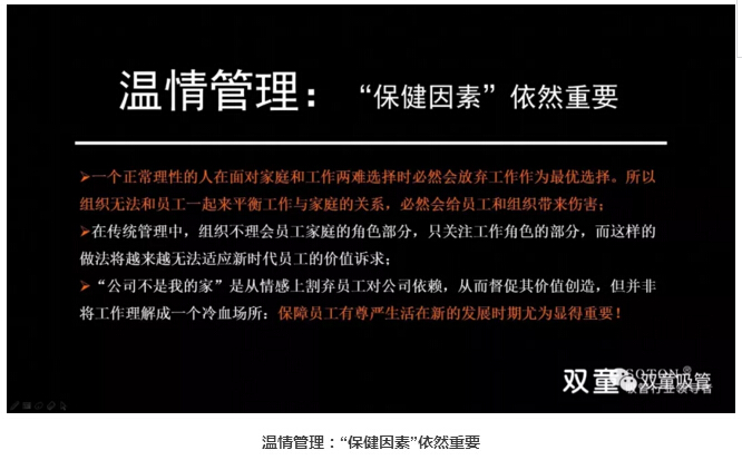 除了授權(quán)和激勵之外,保健因素依然重要。一個正常理性的人在面對家庭和工作兩難選擇時必然會放棄工作作為最優(yōu)選擇。公司不是我的家是從情感上割棄員工對公司依賴,從而督促其價值創(chuàng)造,但并非將工作理解成一個冷血場所:保障員工有尊嚴(yán)生活在新的發(fā)展時期尤為顯得重要!