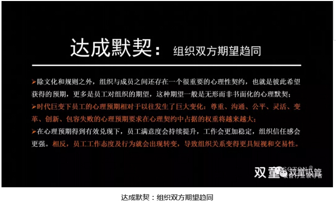 達(dá)成默契,組織雙方的期望趨同:除了文化和規(guī)則之外,組織與成員之間還存在一個很重要的心理性契約,也就是彼此希望獲得的預(yù)期,更多的是員工對組織的期望。