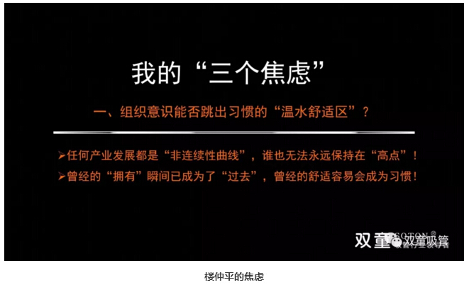 樓仲平分享了自己的第三個(gè)焦慮:2011年,雙童明確再造經(jīng)理人計(jì)劃,選拔培養(yǎng)年輕領(lǐng)導(dǎo)層,管理團(tuán)隊(duì)更加年輕化,雙童管理團(tuán)隊(duì)也更加年輕、有斗志,有激情。但當(dāng)我看到這批年輕的管理團(tuán)隊(duì)臉上洋溢著對(duì)未來(lái)的期待、渴求和夢(mèng)想的時(shí)候,我明白他們現(xiàn)在正嗷嗷待哺,我需要給他們創(chuàng)造更大的空間和更廣闊的平臺(tái),我產(chǎn)生了無(wú)限的壓力和焦慮。我要思考如何創(chuàng)造空間,讓他們實(shí)現(xiàn)更大的夢(mèng)想,我不能讓我的邊界限制企業(yè)的未來(lái)十年,不能讓我的邊界限制年輕有為的管理團(tuán)隊(duì)!