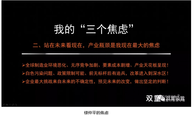 在聽(tīng)到馬云的金句后,樓仲平表示他終于知道原來(lái)馬云也在焦慮。他分享道:我也有自己的焦慮,我深刻理會(huì)到這種焦慮在現(xiàn)在時(shí)代下是油然而生的,這也是這個(gè)時(shí)代的焦慮。這種焦慮來(lái)源于你能看清這個(gè)時(shí)代,感受到這個(gè)時(shí)代的高速變化,感受到制造業(yè)和整體經(jīng)濟(jì)的變化。