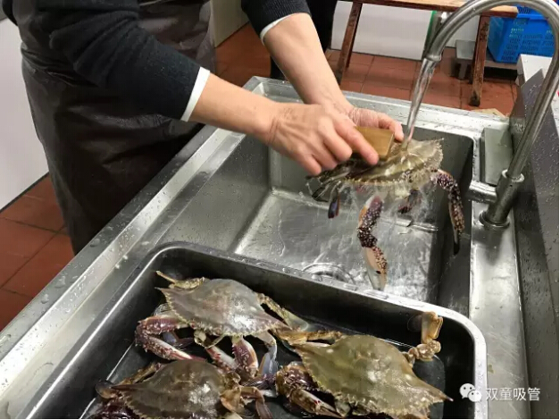 四、用板刷清洗梭子蟹反面以及蟹腳和縫隙。