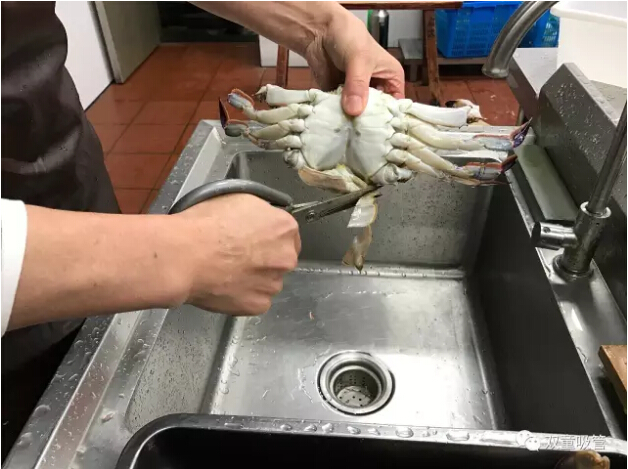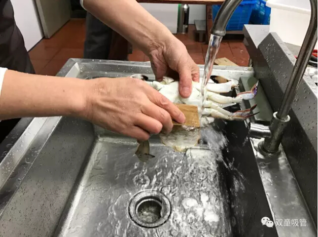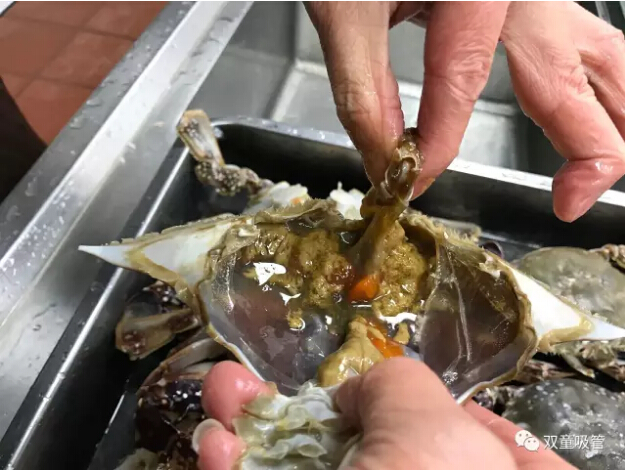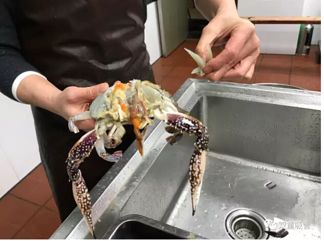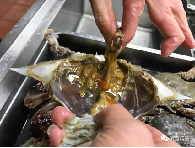 十二、取出砂囊后將蟹身兩側(cè)的蟹鰓(看上去像魚(yú)鰓)用手工拔除干凈,如果蟹鰓底部有烏黑砂子,千萬(wàn)不要用清水沖洗,用干凈牙刷局部清洗一下就可以了。