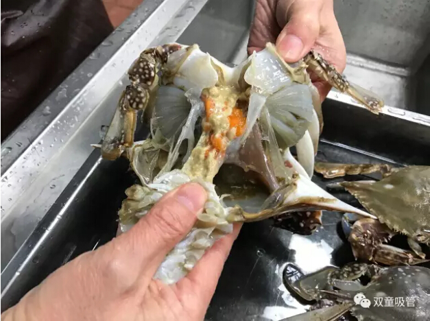 十一、一般情況下砂囊會(huì)隨膏體粘在蟹殼的嘴部,也可能在隨膏體粘在蟹身嘴部,反正一定要找到取出!