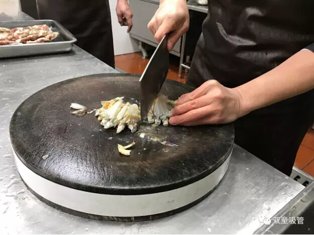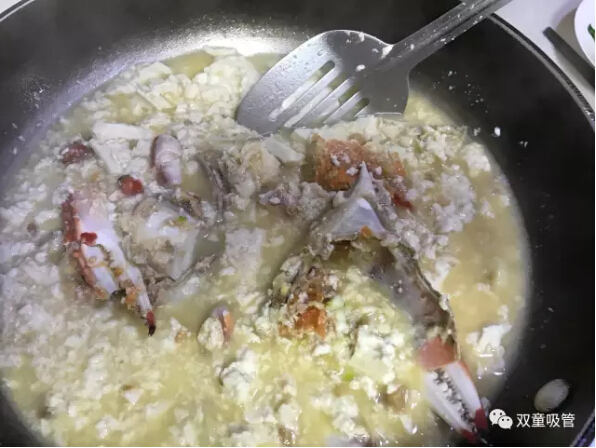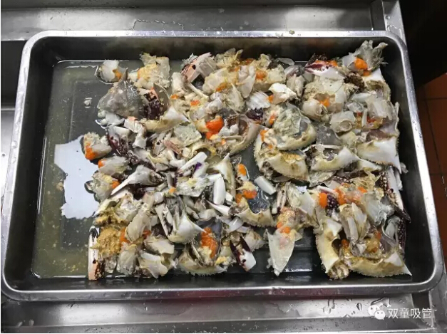 十七、螃蟹清洗宰殺完畢準(zhǔn)備烹煮,宰殺后的螃蟹千萬(wàn)千萬(wàn)不能清洗了,連同黑乎乎湯汁(膏體)一并燒進(jìn)去。