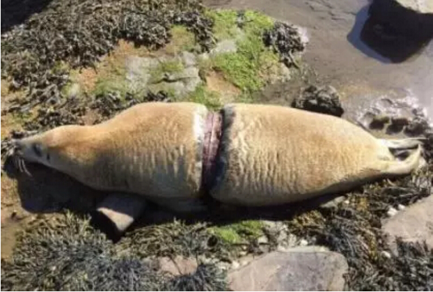 它被塑料打包環(huán)死死套住,自己沒辦法弄掉,越長(zhǎng)大就越緊,最終打包環(huán)卡進(jìn)它的肉里。
