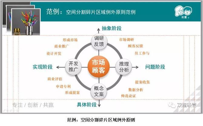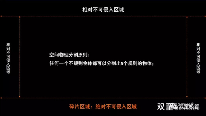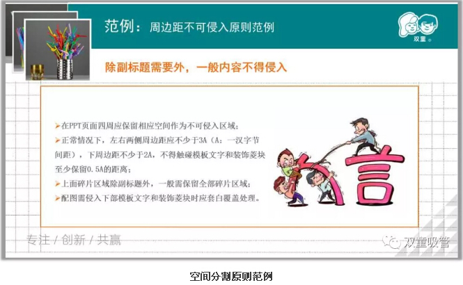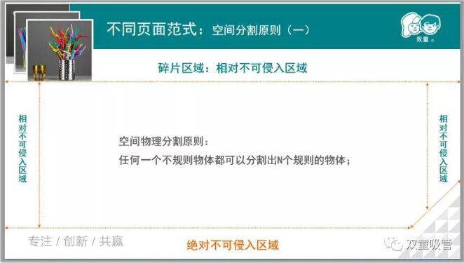 空間物理分割原則是指任何一個(gè)不規(guī)則物體都可以分割出N個(gè)規(guī)則的物體。樓仲平也通過不同版本的PPT范例闡述了空間的分割原則,讓同學(xué)們分清制作PPT的相對不可侵入?yún)^(qū)域及絕對不可侵入?yún)^(qū)域。