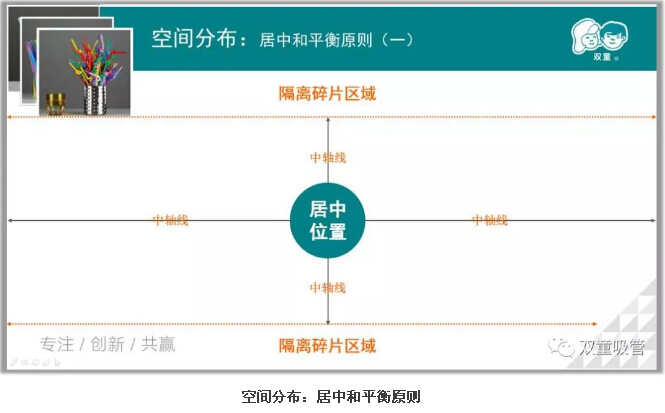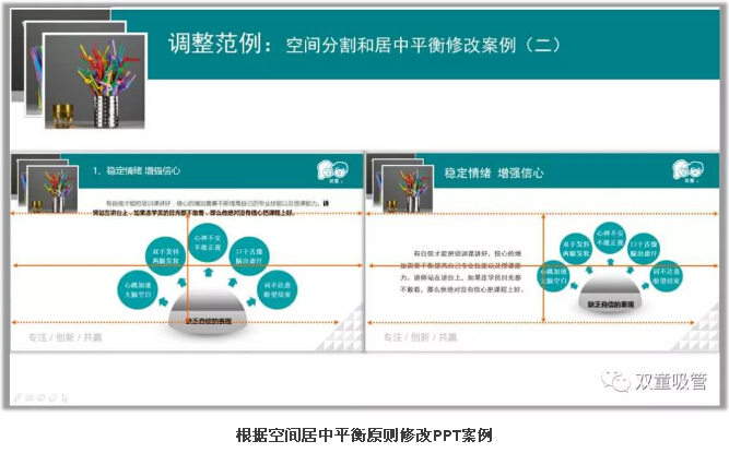 在分享了頁面的設(shè)置和分割原理后,樓仲平通過詳細(xì)的案例和PPT修改方案分享了頁面空間的居中平衡原則,讓同學(xué)們更好的理解PPT空間的布局。