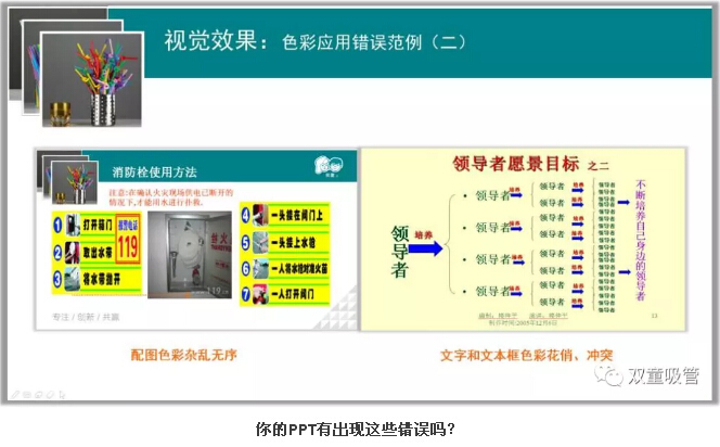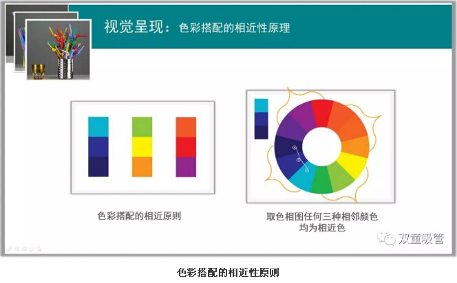 想要制作一個(gè)美觀的PPT,色彩的搭配也尤其重要!樓仲平也分享了色彩搭配的相近原則、色彩點(diǎn)綴的相對原則等技巧,下面就通過圖片來看看色彩的搭配和一些錯(cuò)誤的案例吧!