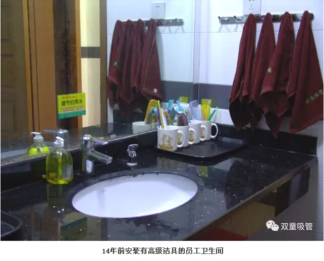 “雙童”很奢,奢在連員工寢室的“水龍頭”都要四五百塊錢一個(gè)!2004年,“雙童”按三星級(jí)標(biāo)準(zhǔn)裝修了所有員工寢室。每個(gè)寢室都配有干凈整潔的洗手間、寬敞明亮的洗衣陽(yáng)臺(tái)和格力的空調(diào),并配有各種家具,還提供24小時(shí)的熱水和純凈水飲用系統(tǒng)。連衛(wèi)生間內(nèi)配置的科勒牌水龍頭價(jià)格就高達(dá)500多元,十多年過(guò)去至今沒(méi)有壞過(guò)一個(gè)。