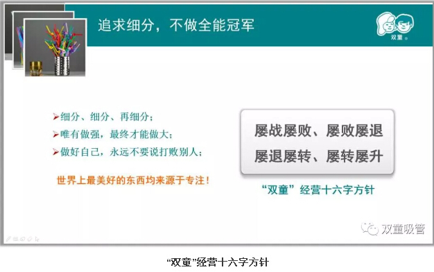 屢戰(zhàn)屢敗、屢敗屢退、屢退屢轉(zhuǎn)、屢轉(zhuǎn)屢升。實際上,“雙童”的這十六字經(jīng)營戰(zhàn)略方針中所蘊含的哲學,就是不斷創(chuàng)新,永不止步!企業(yè)沒有所謂的成功,只有不斷地成長!不管是經(jīng)營什么企業(yè)、制造什么產(chǎn)品,都應該打破傳統(tǒng)的思維模式,在不斷地探索中找到自己的發(fā)展道路!親,你明白了嗎?