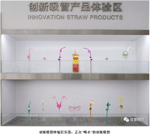 在創(chuàng)新吸管體驗(yàn)區(qū)的左右兩邊分別陳列著愛心吸管、哈哈吸管、卡通吸管、眼鏡吸管、足球吸管、風(fēng)車吸管等十幾種創(chuàng)新吸管。