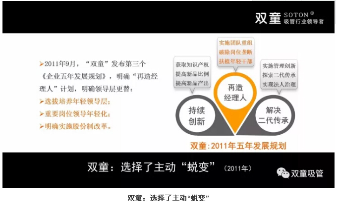 公司創(chuàng)辦初期聘任部分原國營企業(yè)的下崗管理層,這些人客觀上在企業(yè)發(fā)展中做出了巨大的貢獻。但2010年前后,其中的大部分管理層逐漸出現(xiàn)了認知時間軸瓶頸,他們完全憑經(jīng)驗用老方法解決新問題,拒絕接受和應(yīng)用新興事物,團隊的成長遇到了瓶頸。因此,雙童決定重新梳理團隊,在2011年發(fā)布了第三個《企業(yè)五年發(fā)展規(guī)劃》,明確再造經(jīng)理人計劃,明確領(lǐng)導(dǎo)層更替:選拔培養(yǎng)年輕領(lǐng)導(dǎo)層、重要崗位領(lǐng)導(dǎo)年輕化、明確實施股份制改革,慢慢解決管理層老化問題!重組后的雙童團隊平均年齡不到三十歲,大部分核心團隊的工齡在十年以上,學(xué)歷、知識層次和忠誠度大幅提高!