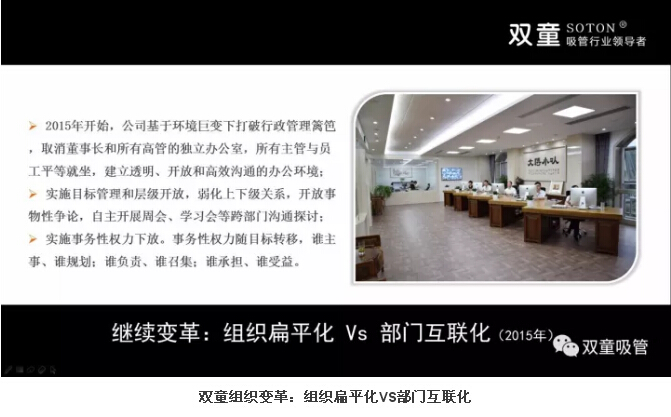 在團隊重塑之后,為了提高團隊溝通效率。雙童2015年開始,對原有組織形式進行思考、實踐和探索,逐漸打破行政管理籬笆,通過平等、透明、開放的辦公環(huán)境,消除部門之間的隔閡,實施目標管理和層級開放,弱化上下級關(guān)系,自主開展周會等跨部門溝通探討,提升部門工作效率。同時,實施事務(wù)性權(quán)力下放,大家以解決事務(wù)為核心,讓權(quán)力隨事務(wù)轉(zhuǎn)移,誰主事、誰規(guī)劃;誰負責(zé)、誰召集;誰承擔(dān)、誰受益,一切以工作結(jié)果為導(dǎo)向。這種從思維到組織結(jié)構(gòu)的創(chuàng)新工作方式,實現(xiàn)了跨部門互通互聯(lián)、共同探討,大大提升了企業(yè)工作效率!