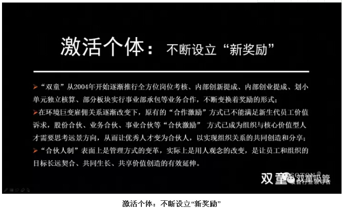 激活組織的同時,雙童也在激活個體上絞盡腦汁,不斷設(shè)置新獎勵。公司從2004年開始逐漸推行全方位崗位考核、內(nèi)部創(chuàng)新提成、內(nèi)部創(chuàng)業(yè)提成、劃小單元獨立核算、部分板塊實行事業(yè)部承包等業(yè)務(wù)合作,不斷變換著獎勵的形式。同時,股份合伙、業(yè)務(wù)合伙、事業(yè)合伙等合伙激勵方式已成為組織與核心價值型人才需要思考遠景方向,從而讓優(yōu)秀人才變?yōu)楹匣锶?,以實現(xiàn)組織關(guān)系的共同創(chuàng)造和分享!