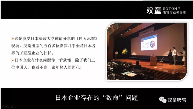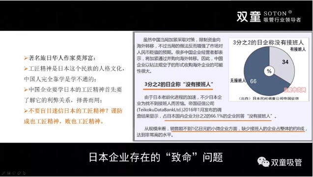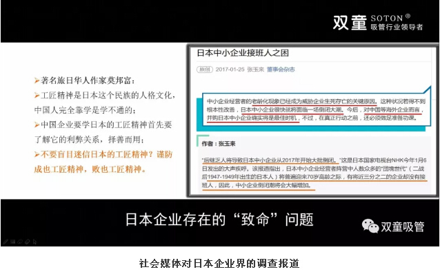 實(shí)際上,無論是從樓仲平二十多年來對(duì)日本社會(huì)的觀察,還是社會(huì)媒體對(duì)日本企業(yè)界的調(diào)查報(bào)道,都能發(fā)現(xiàn)日本在企業(yè)文化和就業(yè)認(rèn)知上存在的巨大轉(zhuǎn)變。有亞洲中小企業(yè)研究第一人之稱的法政大學(xué)教授坂本光司先生一再提醒:過度專注堅(jiān)持只做一個(gè)產(chǎn)品的企業(yè)會(huì)非常危險(xiǎn),至少要做3-5個(gè)產(chǎn)品。創(chuàng)新能力是目前日本中小企業(yè)的優(yōu)勢(shì),但勢(shì)頭已開始衰竭!受互聯(lián)網(wǎng)發(fā)展影響,未來幾年日本大量百年企業(yè)將經(jīng)受前所未有沖擊! 現(xiàn)如今的日本中小企業(yè),正面臨著經(jīng)營(yíng)者老齡化、二代傳承危機(jī)、創(chuàng)新力衰竭等一系列現(xiàn)實(shí)問題。