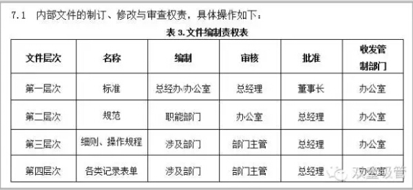 第二層次文件:本公司內(nèi)部的職能部門之間對某一活動的聯(lián)系方式的描述,有關經(jīng)營管理活動步驟的規(guī)范;