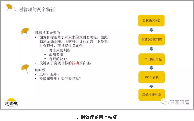 首先,趙宜萱博士和大家分享了計(jì)劃管理的定義,計(jì)劃是一個(gè)很特殊的管理手段,它是為實(shí)現(xiàn)目標(biāo)而尋找資源的一系列行動(dòng)。企業(yè)的每一位員工都必須從高管、中層、基層的角度,分別對(duì)企業(yè)戰(zhàn)略、戰(zhàn)略實(shí)施舉措以及行動(dòng)計(jì)劃有一定的理解和定位才能夠做好企業(yè)的行動(dòng)計(jì)劃。計(jì)劃管理從制定計(jì)劃開(kāi)始,到執(zhí)行計(jì)劃,到檢查最終的結(jié)果,是一個(gè)循環(huán)的過(guò)程。