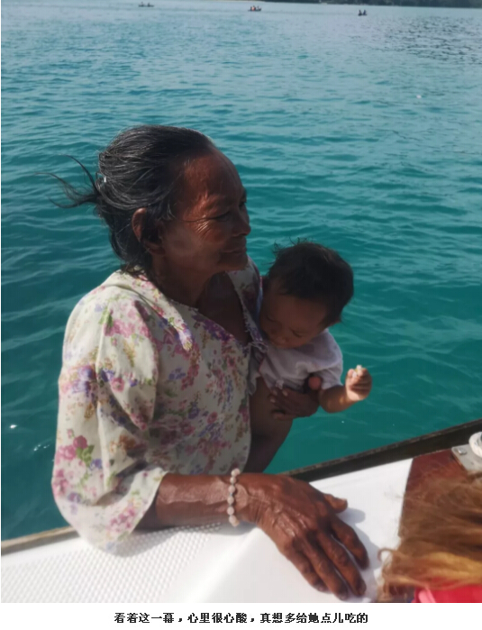當(dāng)我們的快艇一放慢速度,我們就發(fā)現(xiàn)許多小船便快速朝著我們前進(jìn),說實(shí)話心里還是很恐慌的。當(dāng)船慢慢靠近了以后發(fā)現(xiàn),船上基本上是老人、婦人,最多的是小孩,他們曬得黝黑黝黑的,女孩子臉上還涂著黃白色的泥巴,睜著大大的眼睛,不斷地用目光搜尋你身上有沒有他們想要的食物。一旦發(fā)現(xiàn),就賴著你,用央求的眼神可憐巴巴地指著食物,希望你可以把食物分享給他們。我們翻遍了包包,只找到一罐口香糖。姐姐拿出一顆想給一個小女孩,那個小女孩竟然搖搖頭,指著那個罐子表示她想要一罐??紤]到不確定他們能夠明白口香糖是要吐掉的,我們就拒絕了她的要求。小女孩也不生氣,央求了一段時間后,便轉(zhuǎn)移目標(biāo),指了指姐姐頭上戴著的花,想讓我們把花也給她。這怎么行,我們也只有一朵,還是買泳衣的時候送的,后續(xù)大家可以看到這朵花不斷地出現(xiàn)在我和姐姐的頭上,發(fā)揮了卓越的裝飾作用……捂臉。