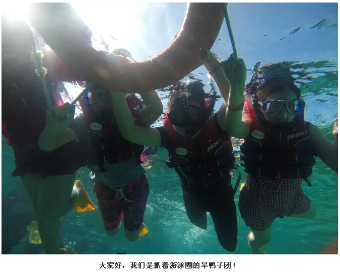 第三個島,是曼達(dá)布安島,我們也沒有上島,只是在島附近浮潛了。我們四只旱鴨子,抓著救生圈,小黑哥領(lǐng)著我們慢慢往遠(yuǎn)處飄。想象著自己是海上的一片浮葉,隨波蕩漾,睜開眼看看海底的珊瑚群和小魚兒游來游去……