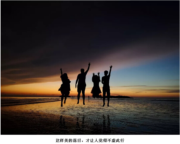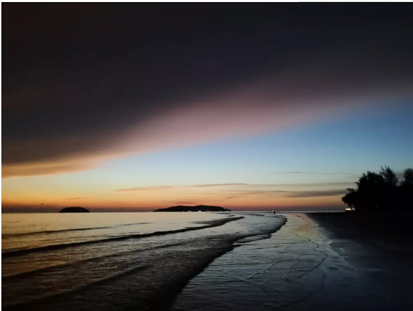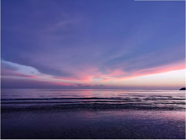 到了太陽快下山時,我們也回到了沙灘上。只見一輪紅日慢慢向山那邊落下去,云彩也被映襯得金黃金黃的,倒映在水中的光也讓人頭暈?zāi)垦#牪婚_眼。沒幾分鐘,太陽就下山了。就當(dāng)我們覺得“世界上最美的落日”也就是不過如此時,神奇的事發(fā)生了!太陽下山以后,刺眼的光芒也不見了,而留下來的云朵開始了他們的表演,演變成了黃色、藍(lán)色、紫色,不斷變幻,像是打翻了顏料盤后幾種顏色混到了一起。瑰麗的云層壓得很低,似乎和大海連到了一起,海天一色。此情此景,讓每個人的心都變得柔軟起來。此時此刻,無語也溫暖,平凡也浪漫。
