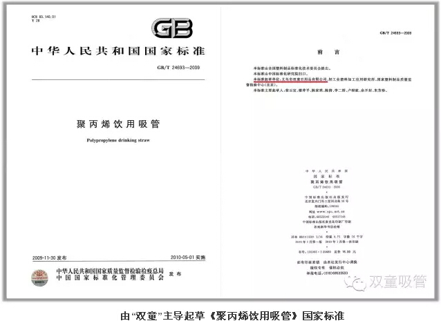 3.2008年11月,由“雙童”主導(dǎo)起草的GB/T24693-2009《聚丙烯飲用吸管》國家標(biāo)準(zhǔn)正式發(fā)布,成為當(dāng)時金華地區(qū)第一件完全意義上的國家標(biāo)準(zhǔn)。