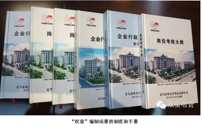 另一方面,“雙童”在二十多年標(biāo)準(zhǔn)戰(zhàn)略的實施過程中,認(rèn)知到標(biāo)準(zhǔn)化工作對企業(yè)規(guī)范管理的重要性,從而引導(dǎo)企業(yè)向制度化和法制化方向延伸。從1997年開始,“雙童”從最簡單的制度規(guī)范入手,逐步深入到行政、后勤、生產(chǎn)、銷售、財務(wù)等十多個板塊的行政管理手冊,從而逐漸形成了企業(yè)制度化工作的標(biāo)準(zhǔn)化和規(guī)范化,推動企業(yè)從“人治”到“法治”轉(zhuǎn)變。