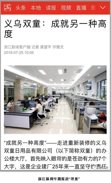 “成就另一種高度”——走進(jìn)重新裝修的義烏雙童日用品有限公司(以下簡(jiǎn)稱“雙童”)的辦公樓大廳,首先映入眼簾的是蒼勁有力的7個(gè)大字,這是企業(yè)建廠25年來(lái)一直堅(jiān)守的責(zé)任和使命。