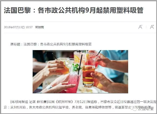 法國《歐洲時報》報道稱,巴黎市議會投票通過的一項決議規(guī)定:從9月開始,各大市政公共機構(gòu)比如學(xué)校、養(yǎng)老院、體育場和博物館等,將逐漸禁止使用塑料吸管。