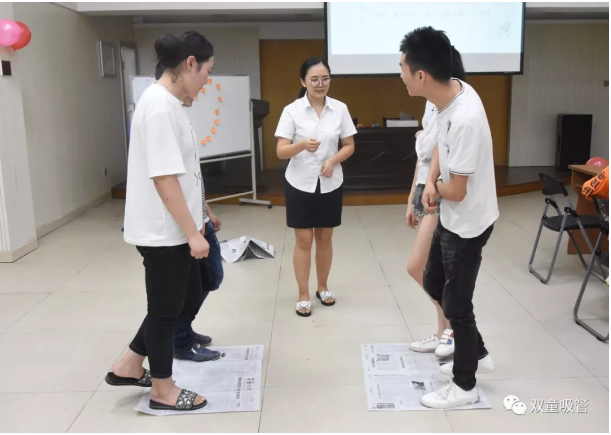 趁熱打鐵!第二個小游戲—“勝者為王”也登場啦!所有配對的男神女神們分為AB兩組,兩位男女隊員單腳站在報紙上,兩組面對,派代表進行劃拳,失敗者將自己的報紙對折,再繼續(xù)游戲,直到游戲者單腳無法站立報紙上或腳離開自己的報紙,游戲結束。通過小游戲的開展,單身男女們真是“親密無間”呀!