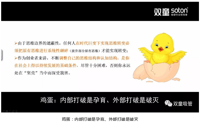 所以,作為創(chuàng)業(yè)者不斷調(diào)整自己的思想狀態(tài)和文化結(jié)構(gòu),是你在社會(huì)上得以持續(xù)生存的基礎(chǔ)條件,否則你永遠(yuǎn)處在堅(jiān)殼當(dāng)中而深受戕害。就好比‘雞蛋’,從內(nèi)部打破是孕育新生,從外部打破是破滅。
