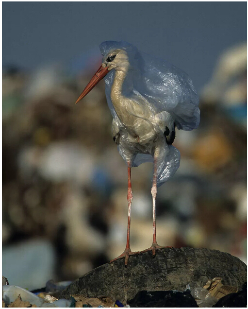 一只鸛周身被塑料袋纏繞,擺脫不得,