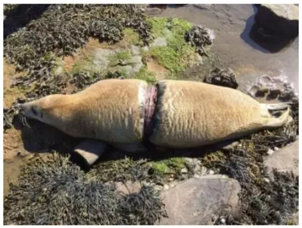 英國海邊,躺著一只奄奄一息的海豹,塑料環(huán)直接勒進(jìn)了肉里。