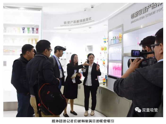 來(lái)到可降解吸管展示區(qū)時(shí),吸管妞介紹了45天就可以化解成水和二氧化碳的“雙童”生物質(zhì)可降解吸管,境外媒體團(tuán)的記者們表示現(xiàn)在各國(guó)正在限塑,如此環(huán)保的產(chǎn)品一定是未來(lái)的趨勢(shì)所在!