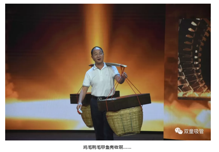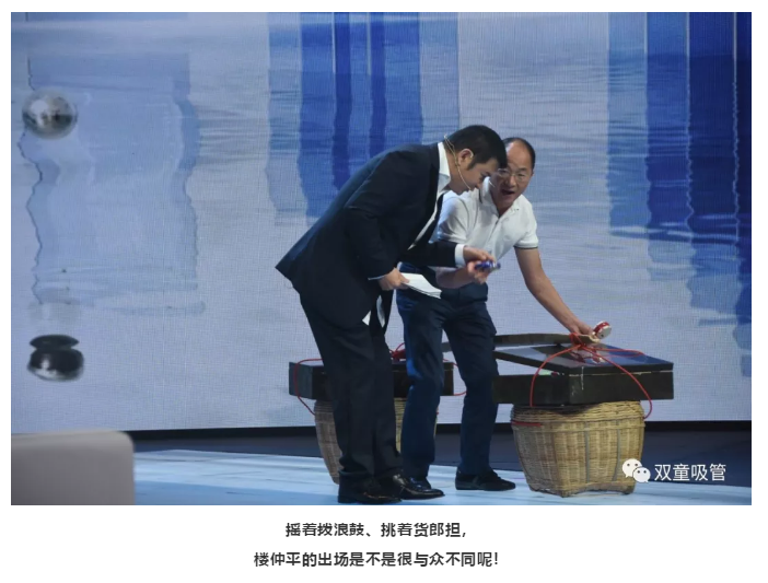 相比于其他兩位嘉賓,“雙童”樓仲平的出場方式可算是最“與眾不同”啦!看,當(dāng)主持人“鷗哥”邀請樓仲平出場時,他竟然搖著撥浪鼓、挑著貨郎擔(dān),口里還喊著“雞毛鴨毛甲魚殼收啊……”就上場了!