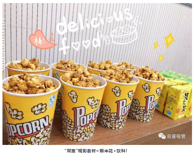 電影開始之前,大家早早的就來排隊領取“雙童”觀影標配套餐:爆米花+飲料!還有小觀眾甚至自帶了放大版爆米花桶,對吸管妞說:“我今天的愿望就是把這桶裝滿!我和小伙伴就要這一桶!”吸管妞當然要滿足他們的愿望啦,不夠還可以續(xù)“桶”哦