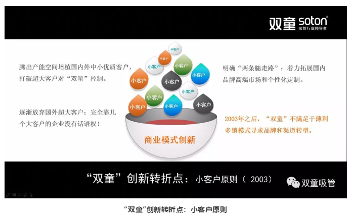所以,這個(gè)時(shí)候我們逐漸放棄國(guó)外一些大客戶(hù),開(kāi)始實(shí)施小客戶(hù)原則,到現(xiàn)在積累了16000多家中小客戶(hù),從而讓“雙童”不會(huì)受客戶(hù)所限。