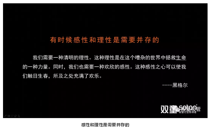 通過中西方文化的對比,我們可以發(fā)現(xiàn):我們不能只有“感性思維”,但也不能一味的倡導西方的“理性思維”。唯有“以中為體、以西為用”,將感性思維和理性思維相融合,才能更好地平衡工作和生活!最后,樓仲平也巧妙的用黑格爾的名言分享了感性和理性是需要并存的。