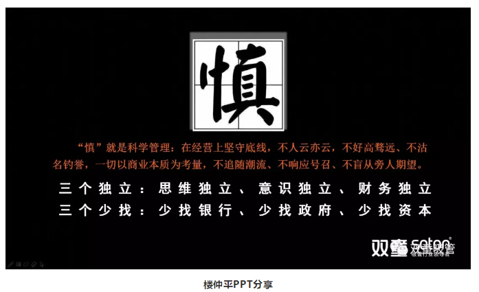 作為企業(yè)來(lái)說(shuō),如果你能做到這兩個(gè)“少找”,你的企業(yè)一定能活得更久。因?yàn)槟銜?huì)更客觀、更市場(chǎng)化、更經(jīng)得起外部宏觀的影響。“雙童”就是如此,沒(méi)有太多的負(fù)債,甚至不負(fù)債。這樣一來(lái),無(wú)論外面產(chǎn)生什么樣的環(huán)境,相對(duì)來(lái)講做好自己。企業(yè)的使命不是做多大,如果一生當(dāng)中能把某一件極小的事情做得足夠好的時(shí)候照樣偉大,而非要做成百億企業(yè)。