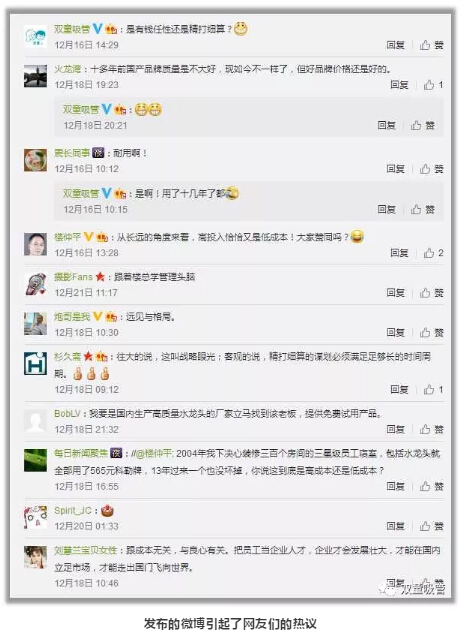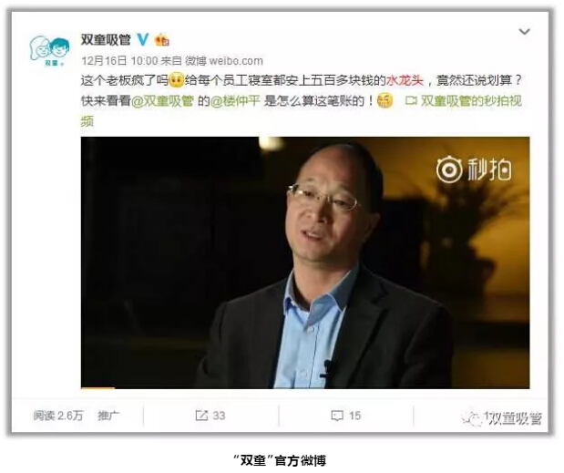 許多民營企業(yè)都認為不必給員工用太好的硬件,希望用最低的成本創(chuàng)造最大的價值。“雙童”官方微博曾發(fā)布的一條關于14年前老板給每個員工寢室配置了500多元水龍頭的微博就引發(fā)了網(wǎng)友的熱議,不少粉絲都很詫異一個水龍頭五百多元老板居然說不貴!