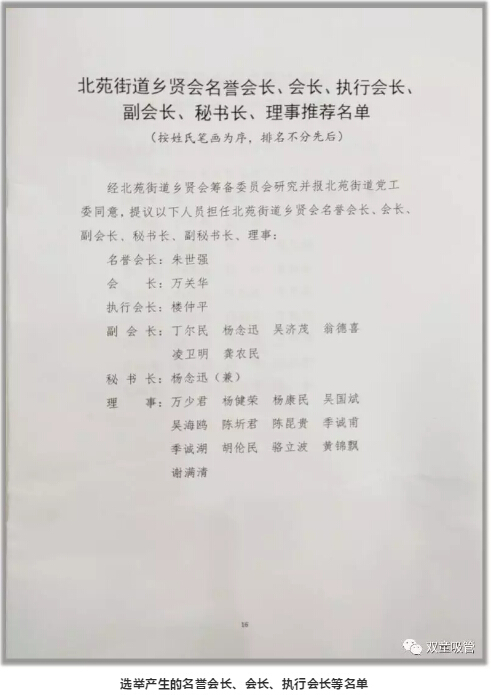 因此,大會上討論通過了北苑街道鄉(xiāng)賢會章程(草案)、北苑街道鄉(xiāng)賢會選舉辦法(草案)、選舉產(chǎn)生了北苑街道鄉(xiāng)賢會名譽(yù)會長、會長、執(zhí)行會長、副會長、秘書長以及理事成員。其中“雙童”樓仲平被推選為北苑街道鄉(xiāng)賢會執(zhí)行會長。