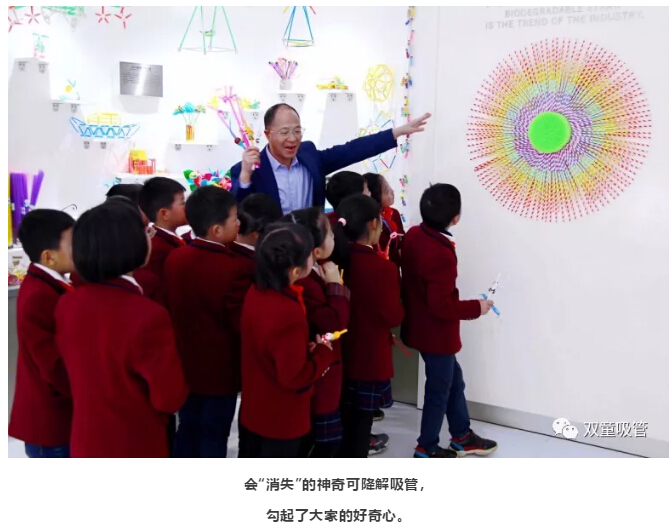 每到一個(gè)吸管展示區(qū)域時(shí),孩子們都緊緊跟在“雙童”樓仲平的身后,認(rèn)真用心聆聽(tīng)!相比于傳統(tǒng)吸管,造型奇特并擁有各種不同功能的創(chuàng)新吸管更是引起了孩子們的濃厚興趣。