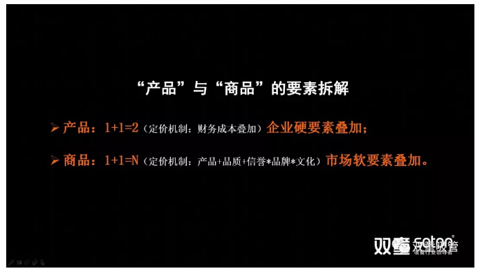 但商品是將產(chǎn)品、品質(zhì)、品牌、文化等市場軟要素疊加,1+1=N。在產(chǎn)品本身內(nèi)核不發(fā)生改變的情況下,產(chǎn)品之外的文化性、精神性、趣味性、情感性等屬性不斷地外延,通過“創(chuàng)始人”、“團(tuán)隊員工”、“價值觀”、“超鏈接”等又形成了產(chǎn)品的種種不同屬性。