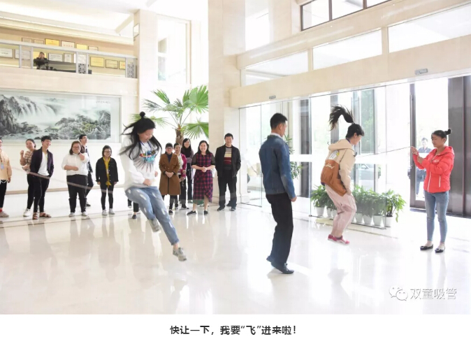“預(yù)備,開始”!隨著主持人的一聲令下,跳繩項目就正式開始啦!甩繩者有節(jié)奏的甩動繩子,跳繩者則一個個身輕如燕,找準(zhǔn)時機(jī)沖向繩子!