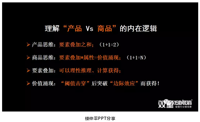 樓仲平引導大家思考“產(chǎn)品 Vs 商品”的關系,在這個模型中,產(chǎn)品本身(一根吸管)只是組成“商品”的基礎核心,產(chǎn)品只是企業(yè)的一個載體,是最基本的成本相加,1+1=2。
