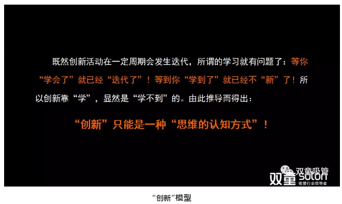 經(jīng)過前兩個“思維模型”的鋪墊,最后,樓仲平引導大家認知:昨天還是“創(chuàng)新”的東西,今天就未必還是“新”。所以,“創(chuàng)新”是有“時間軸”的,隨著“時間軸”不斷后移,原有的“創(chuàng)新”有效變成了無效,創(chuàng)新活動也就“無窮無盡”!