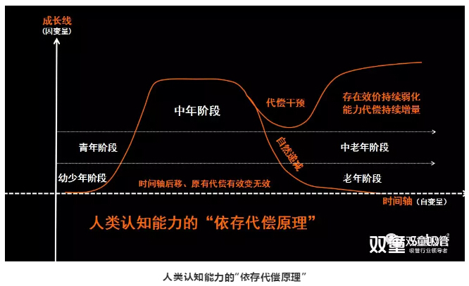 在該模型中,我們能夠看到人類的認知從幼少年階段開始,經(jīng)過青年階段,到達中年階段的巔峰期。但隨著年齡的不斷增長,人類的認知能力開始自然遞減,最終接近幼少年時期的認知能力。在這個過程中,如果人類想要改變這一自然的“墮變規(guī)律”,就必然需要通過“代償干預”,對自身進行不斷地調(diào)整和干預,從而讓認知能力從“下墮”走向“上揚”,讓能力代償持續(xù)增量!